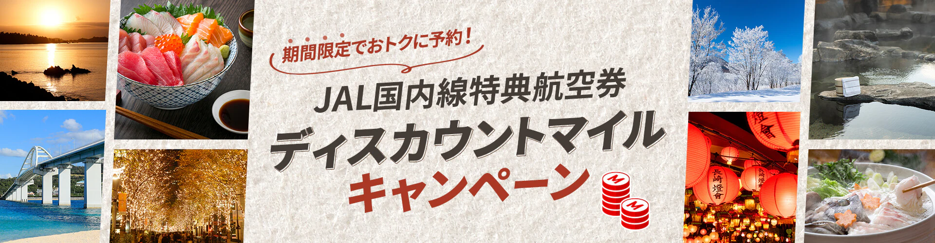 期間中、対象のJAL国内線特典航空券の本キャンペーン用の席に空きがある場合、通常より少ないマイル数で申し込みできる、減額マイルキャンペーンです。