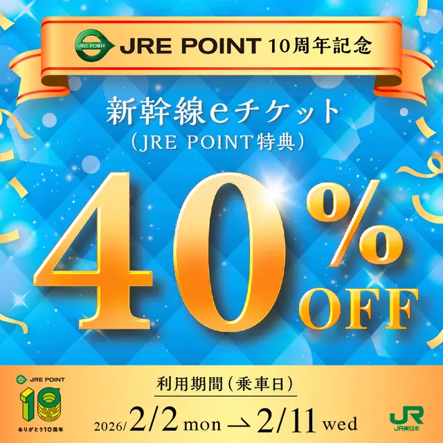 JREポイントは2026年2月に10周年を迎え、様々なキャンペーンを展開しています。11月にはポイントを新幹線や在来線特急のチケットにおトクに交換できる「新幹線eチケット(JRE POINT特典)」の20%OFFキャンペーンがありましたが、2月はなんと40%OFFです!!!