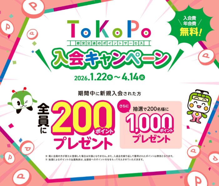 都営交通のポイントサービス「ToKoPo(トコポ)」は、記名式PASMOで都営交通(都営地下鉄、都営バス、東京さくらトラム(都電荒川線)、日暮里・舎人ライナー)に乗車するたびにポイントがたまるサービスです。